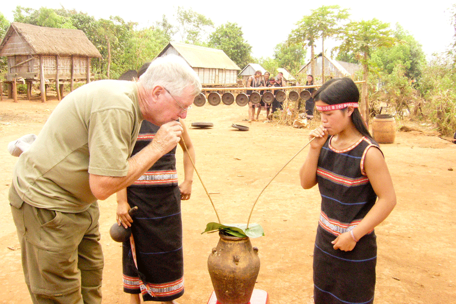 Stop by a white sandy bank circled by hills, forests and clear water for a picnic lunch and a swim. The day ends with a gong show where villagers including young women and old men in traditional dress dance around a bonfire. Have dinner at the village. Overnight at the village communal house at Konktu. Dak Bla (big river in the Ba Na people’s language)