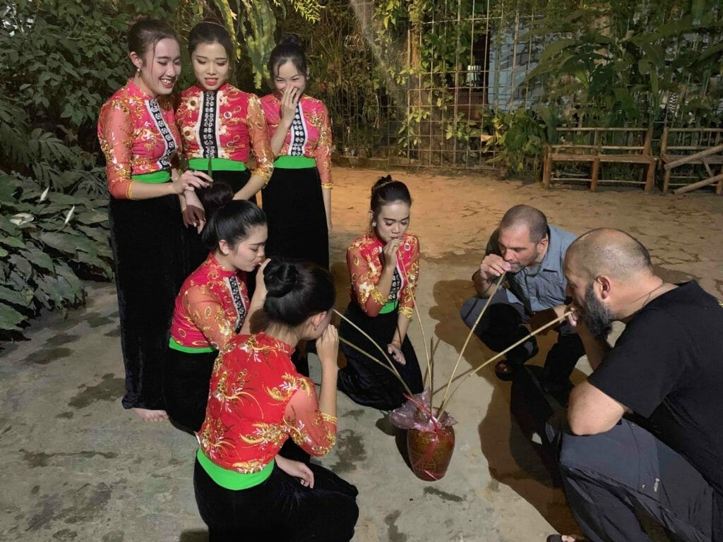 After a light lunch in Hoa Binh Province, we cross Thung Khe, one of the most beautiful mountain passes in North Vietnam then descent to the mountain valley settlement of Mai Chau. After dinner we join performance, where you can dance and share a range of special liquors (rice wine) with the locals. Overnight in a house-on-stilts of the Thai people.